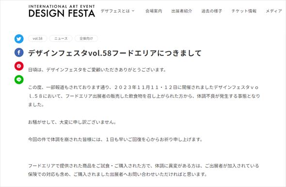 11月11〜12日に開催された「デザインフェスタvol.58」のフードエリア出展者が販売した飲食物を食べた人から、体調不良が発生する事態になったとして、同イベントは「お騒がせして、大変に申し訳ございません」と謝罪。フードエリアで提供された商品を試食・購入して体調に異変がある場合は、出展者に問い合わせてほしいとしています。
