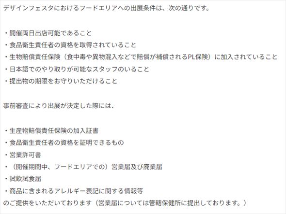 デザインフェスタは、フードエリアへの出展には、食品衛生責任者の資格を取得していることや、生産物賠償責任保険(食中毒や異物混入などで賠償が補償されるPL保険)に加入していることなどを条件にしていると説明しています。