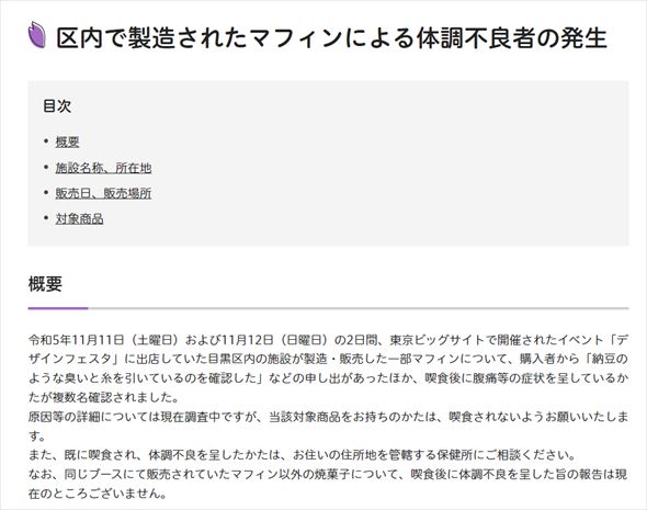 当該のマフィンは11月11〜12日に東京ビッグサイト(東京・有明)アートイベント「デザインフェスタ」に出店していた店舗「Honey×Honey xoxo(ハニーハニーキス)」が販売したもの。一部について購入者から「納豆のような臭いと糸を引いているのを確認した」などの申し出があり、食べた後に腹痛などの症状が出た人が複数人確認されたとしています(関連記事)。