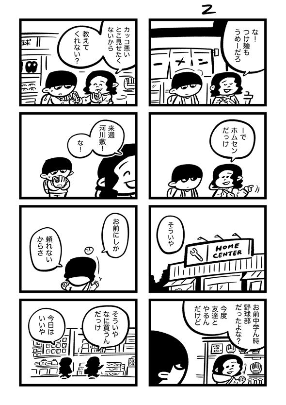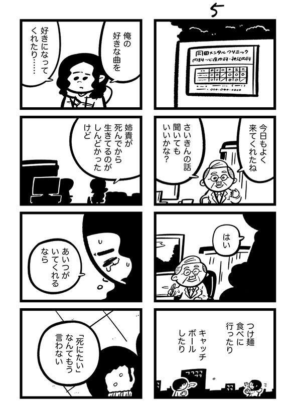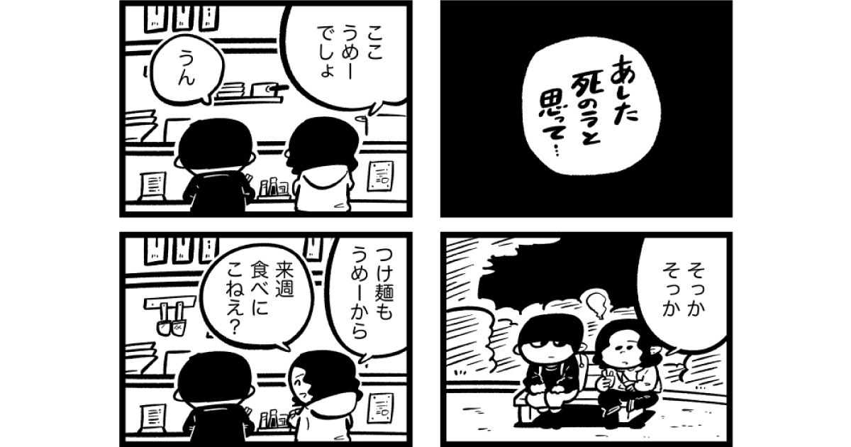 しかし、友人は「そっかそっか」「じゃあ最後の飯行こうぜ」と軽く流し、2人でラーメン屋へ。その後も一緒に遊ぶ予定を入れてくれます。実はこの友人もまた、姉を亡くしたことから心の状態を悪くしており、おかっぱ頭の男の子と一緒にいることが生きる支えになっていたのでした。