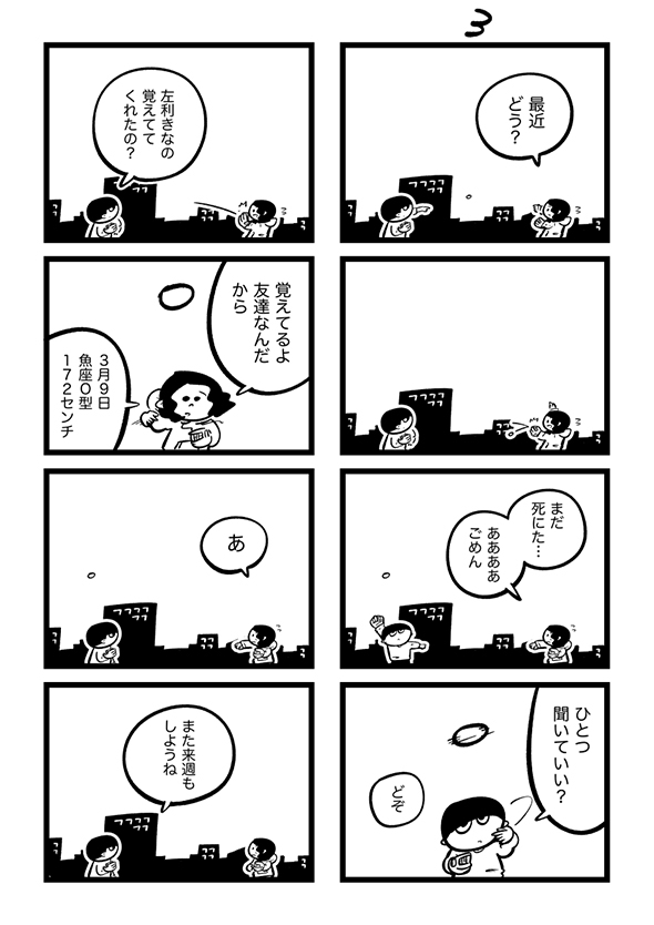今これを描いて「死にたくなるときもあるけど、頑張って生きようぜ」みたいなことは言えませんが、それでも生きていると新しい楽しみに出会うかもしれない、今の苦しい時間もいつか違う形に変えられるかもしれないという小さい可能性を感じてもらえたらいいなと思っています。