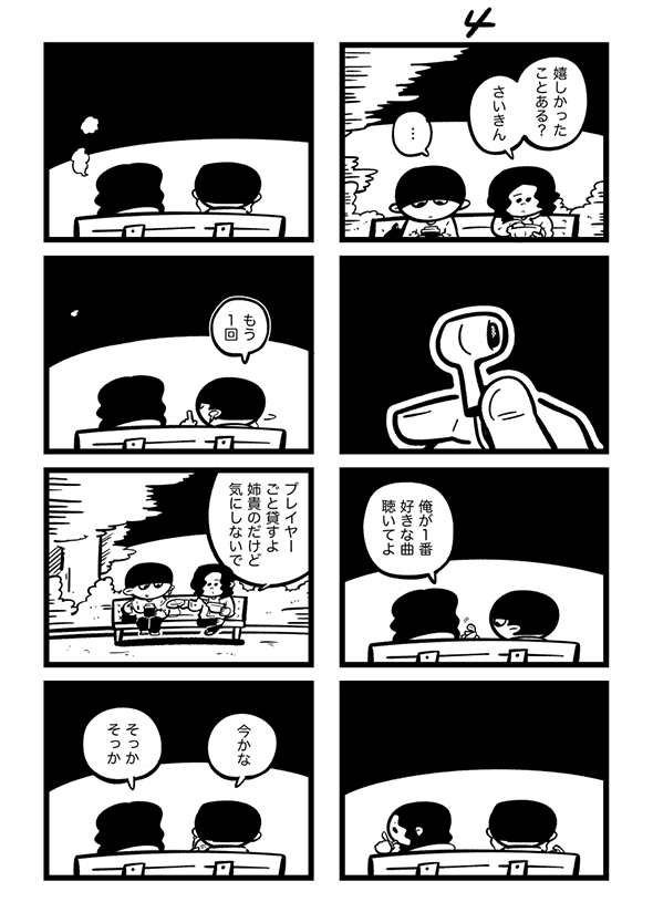 一緒にCDショップに行き、店長のオススメを聞いて視聴し、2人で「買う」「あの店も店長も最高だろ」「うん、また行きたい」と意気投合。友人はその後、姉の形見であるCDプレーヤーを貸してくれますが、おかっぱ頭の男の子は家庭内暴力を受けており、父親にそのプレーヤーを破壊されてしまいます。どうしてもそのことを伝えることができず、それから2人の関係はギクシャクしたものに。