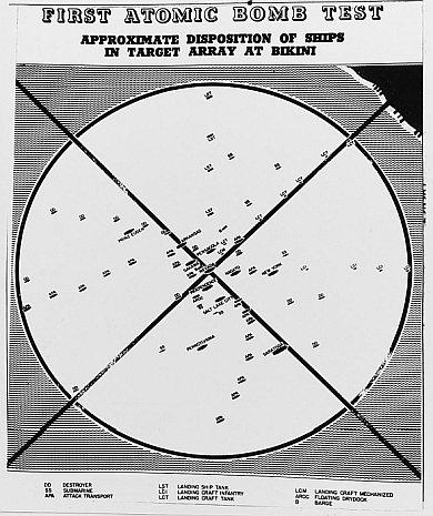 空中爆発実験における標的艦配置。爆心地には米戦艦「ネバダ」がいて、そのすぐ近くに酒匂と長門が配されている(Naval History and Heritage Commandから)