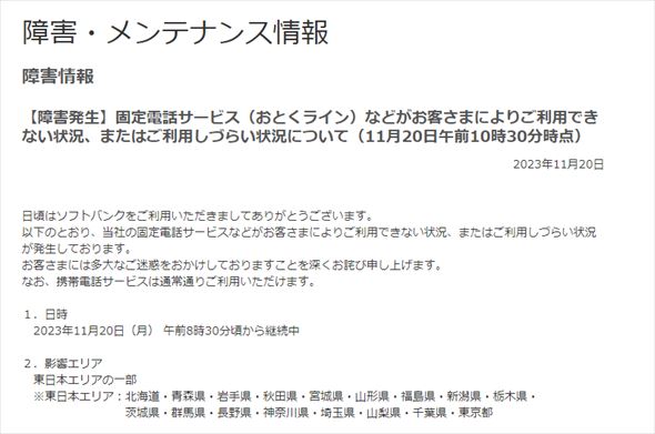 ソフトバンクは11月20日、固定電話サービスで障害が発生していると明らかにしました。同社では18〜19日にも同様の障害が発生していました。