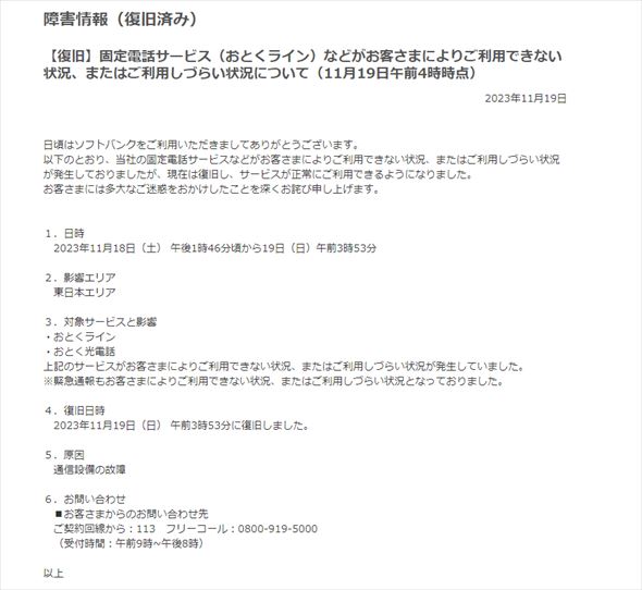 ソフトバンク、固定電話サービスでまた障害 東日本エリアの一部に影響【復旧】