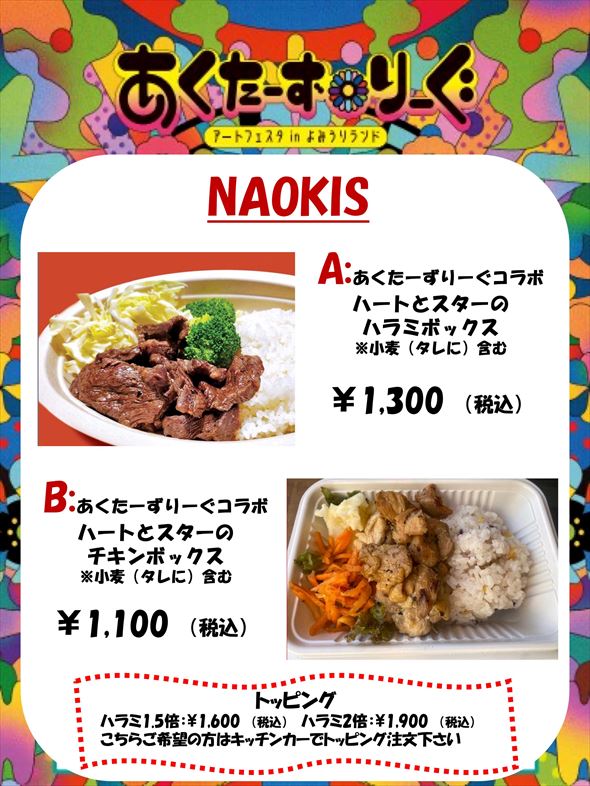 「あくたーずりーぐコラボ ハートとスターのハラミボックス」「あくたーずりーぐコラボ ハートとスターのチキンボックス」(あくたーず☆りーぐの公式Xアカウントから)