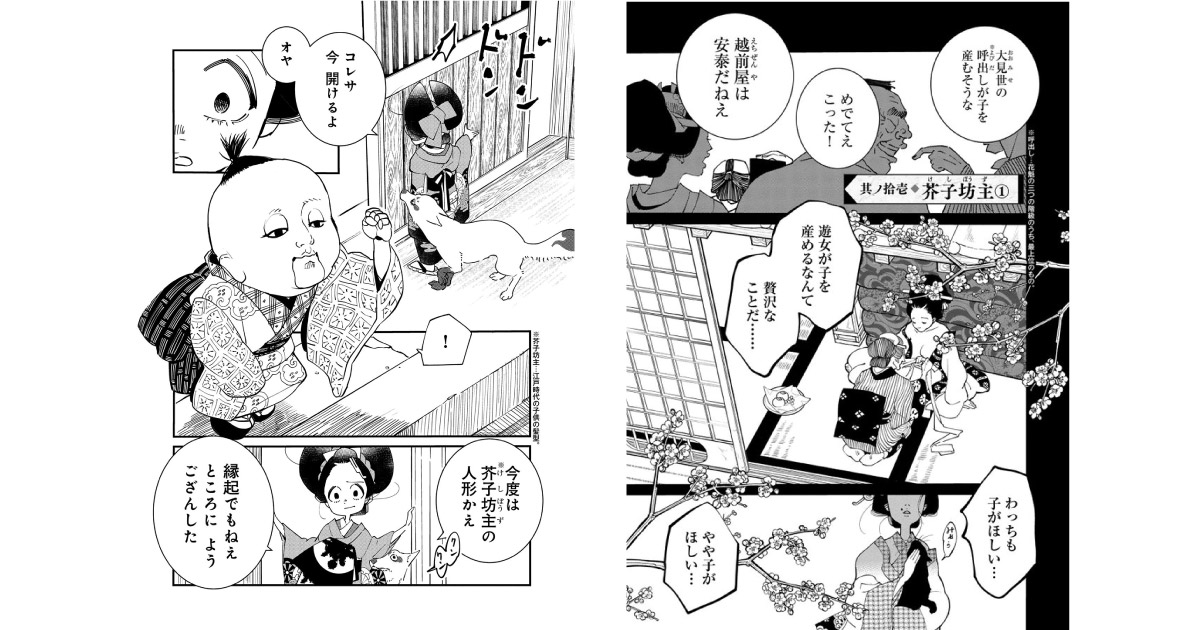浮世と冥土のはざまにある鎮守の社に迷い込んでしまった遊女・あおが、宮司を務める楽丸(らくまる)とともに、社を訪れる遊女などの魂を救っていくストーリー。Xで話題になったエピソードで鎮守の社に現れたのは、芥子坊主(けしぼうず)の人形。楽丸はそれを童(わらべ)の霊だと言い、「浮世に残した母様に会わせてあげましょう」と、母がいる遊女屋まで、あおに連れて行かせます。
