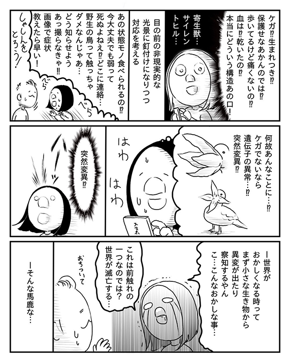 あまりにも非現実的な光景に困惑した武村さんは「ケガ?」「生まれつき?」「ケガでないなら遺伝子の異常……!?」「突然変異!?」「これは前触れのひとつなのでは? 世界が滅亡する……」と、さまざまな考えが湧いてきて動揺。