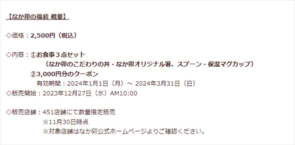 なか卯、2024年福袋を発売 3000円分のクーポンとなか卯の丼入りで2500円