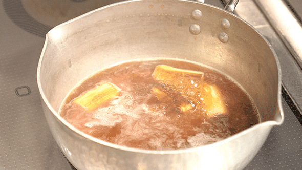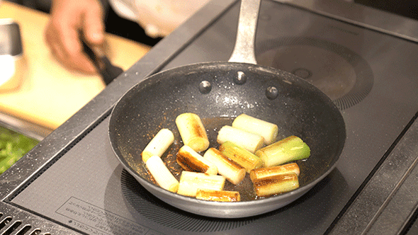 注文を受けたら、小鍋で温めただしの中に白ねぎを入れる。沸騰前に白ねぎを入れることで、白ねぎの旨みが特製だしにより溶け出しやすくなる。