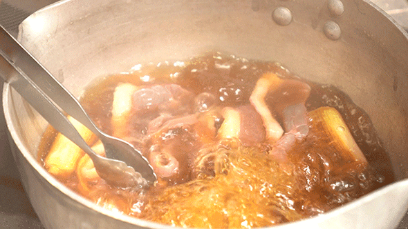 さらに『鴨ねぎうどん』は、具材の調理工程でもこだわりがすごい。具材をおいしくするための仕込みから各店舗で丁寧に行っているのだ。企業秘密の部分もあるとのことだが、今回はその工程の一部を特別に見せてもらった。
