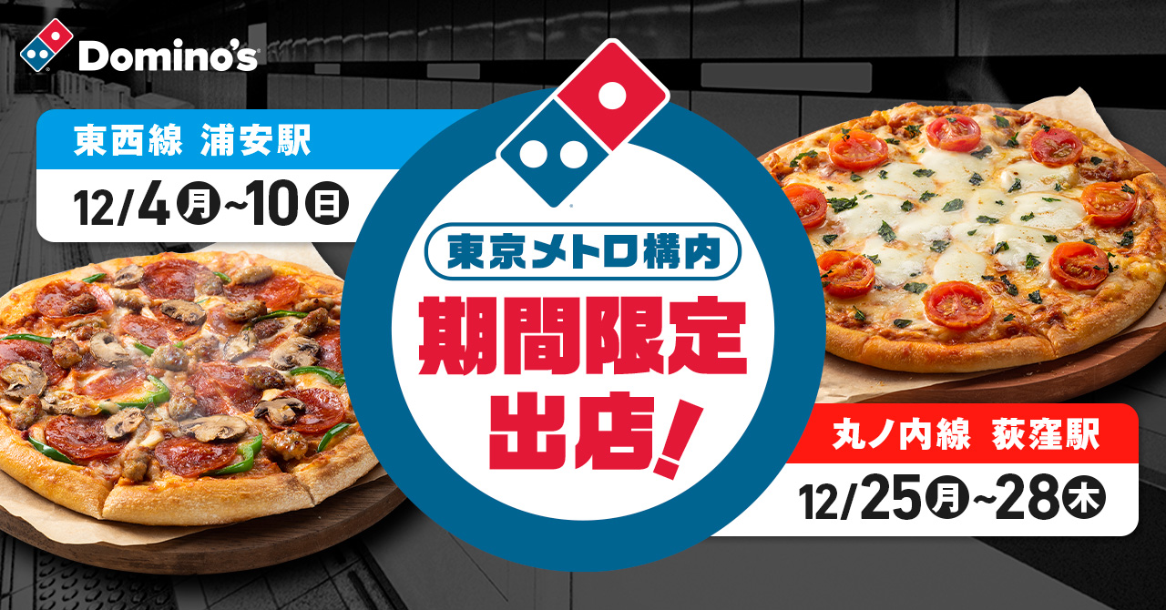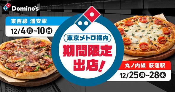 ドミノ・ピザは期間限定で、東京メトロ東西線の浦安駅(千葉県浦安市)と丸ノ内線の荻窪駅(東京都杉並区)に出店します。駅構内への出店はドミノ・ピザ初の試みとしています。