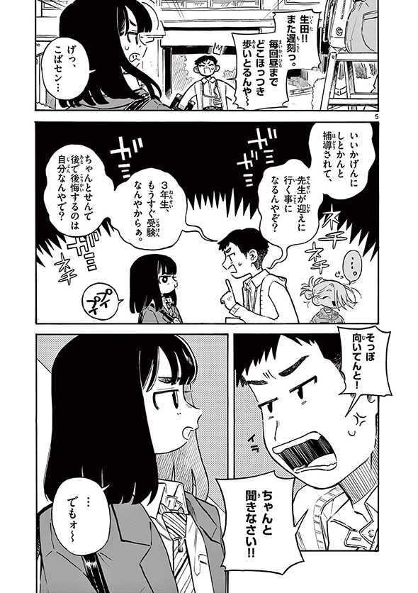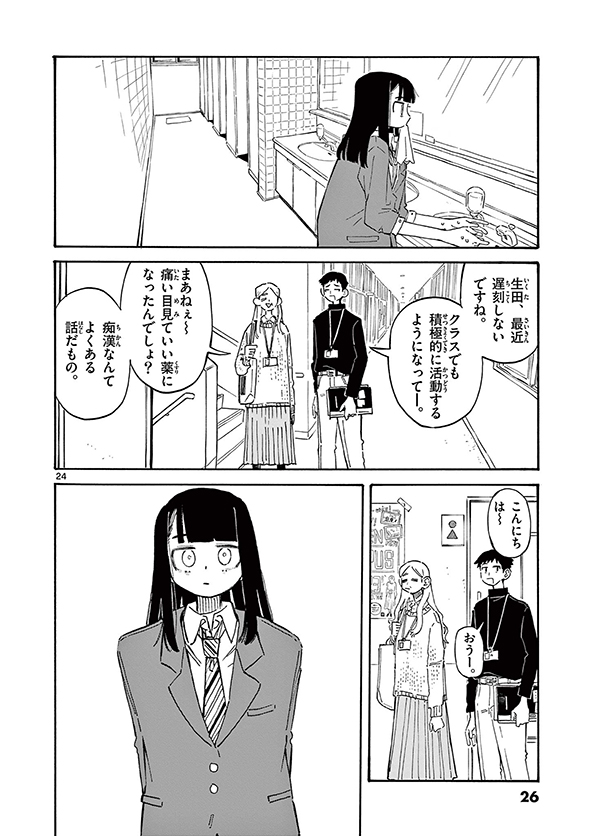 ある日の朝、生田は電車内で痴漢被害にあい、自力で現行犯逮捕。本当はショックな出来事だったのですが、ケラケラ笑っていい子に振る舞います。そのことに気付かない親は「示談金なかったら、お前の進学費用大変やったしラッキーやな」と不器用に励まし、先生たちは「最近遅刻しないですね」「痛い目見ていい薬になったんでしょ?」と安堵するのでした。