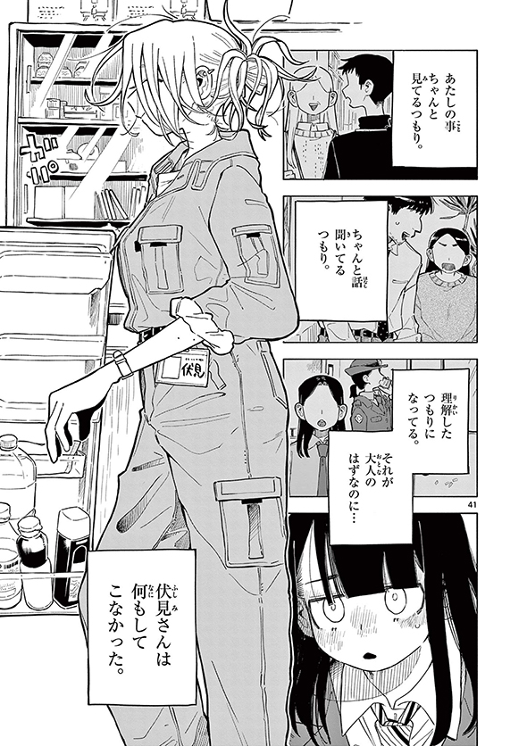 伏見さんは、その話を黙って聞くだけ。他の大人と違って自分の都合や考えを押し付けるのではなく、ただ笑って缶コーヒーを渡してくれるのでした。