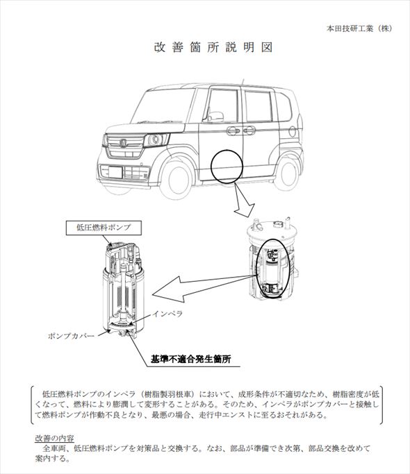 原因は燃料装置(低圧燃料ポンプ)の不具合。低圧燃料ポンプのインペラ(樹脂製羽根車)の成形条件が不適切なため、燃料により膨潤して変形することがあるとのこと。そのためインペラがポンプカバーと接触して燃料ポンプが作動不良となり、最悪の場合、走行中エンストに至るおそれがあるとしています。