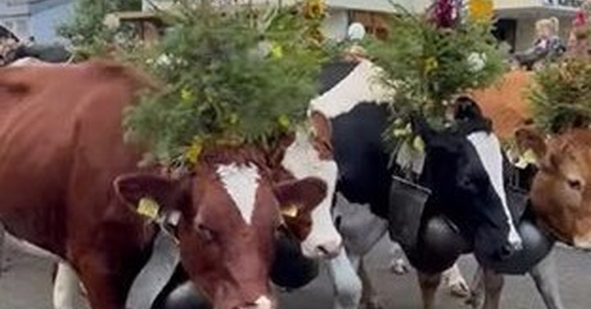 動画が撮影された場所はスイス。毎年、夏から秋に移り変わる時期になると、高山の牧草地から牛たちをおろして放牧期の終わりを告げる「カウパレード」がおこなわれます。