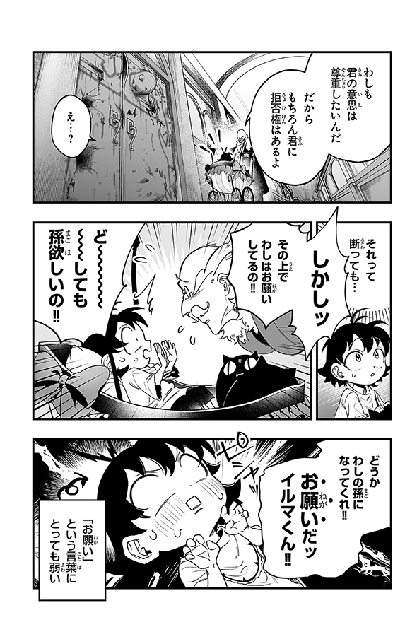 看病の甲斐あって元気になったサリバンは、イルマをこれでもかというほどにかわいがり、「どうかわしの孫になってくれ!! お願いだッ」と懇願。断ることを知らないイルマは困ってしまいます。