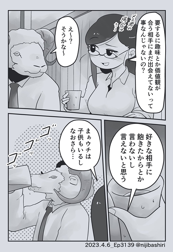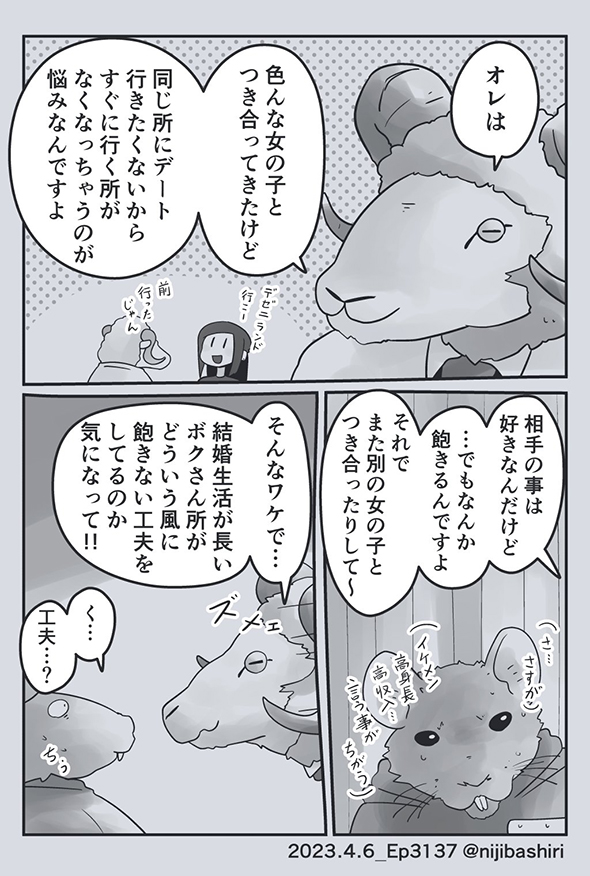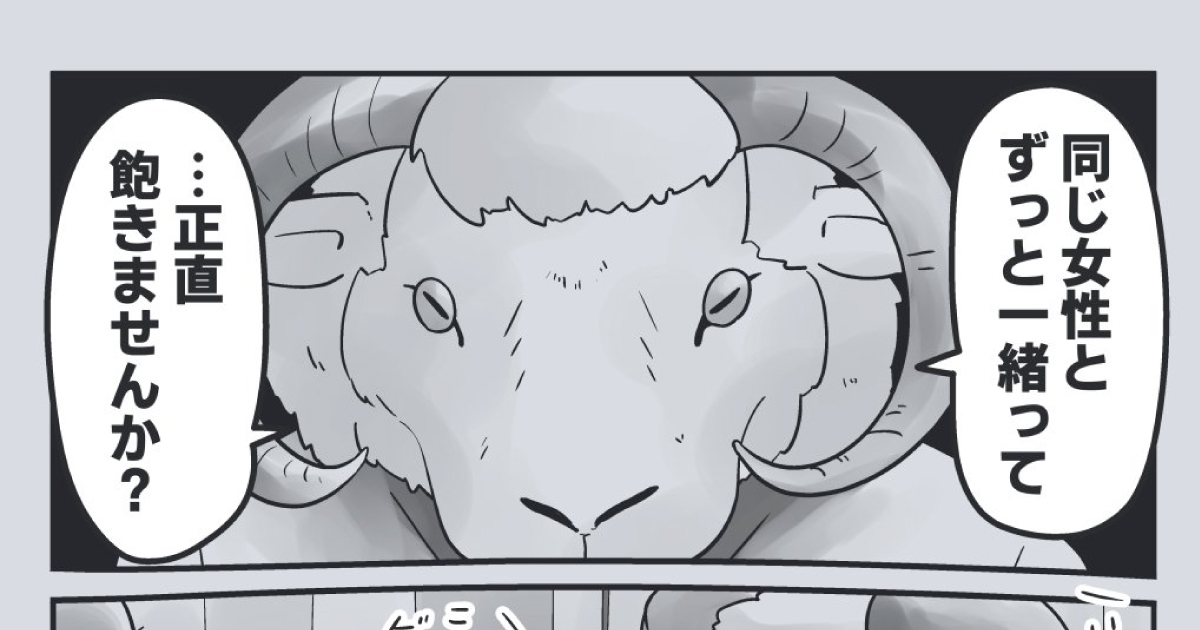 同じ女性とずっと一緒って……正直飽きませんか?―― そんな疑問をテーマにしたマンガに、X(旧Twitter)で約2.7万いいねが集まっています。作者は虹走さん(@nijibashiri)。