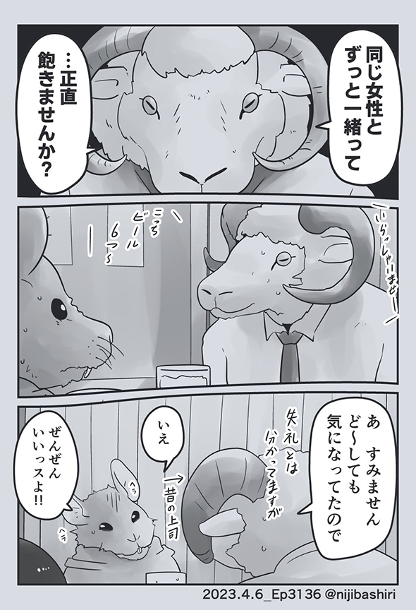 ある日の飲み会、既婚者の虹走さんに対して、当時の職場の上司が「同じ女性とずっと一緒って……正直飽きませんか?」「どういう風に飽きない工夫をしてるのか気になって!!」と質問。