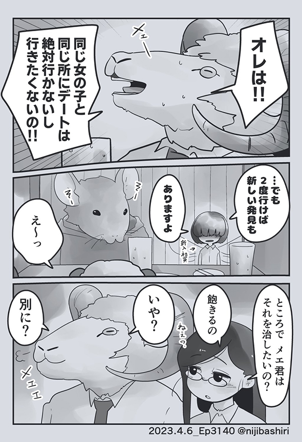 ――― 虹走さんは、この「飽きる」気持ちは理解できますか? 本作に触れたブログ記事では「メエさん(当時の上司)にとってデートはとても特別なもので、だからこそ、行き先選びに苦労していたのではないか」という趣旨の説明をしていますが……