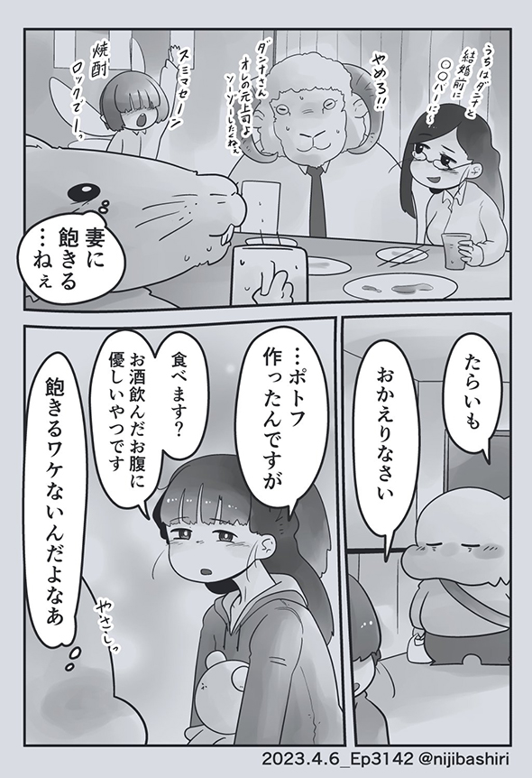 妻との出来事を中心としたマンガをSNS上に公開しているほか、妻に癒された話を描いた「妻で心が安らいだ話」、創作マンガ「私がコンプレックスと少し仲良くなれた話」などを連載しています。