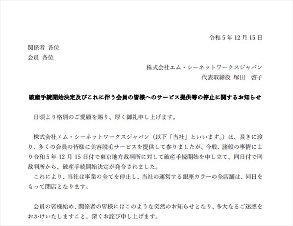 エム・シーネットワークスジャパンは事業を全て停止し、全店舗を閉店したとしており、問い合わせなどについては破産管財人のWebサイトを案内しています。