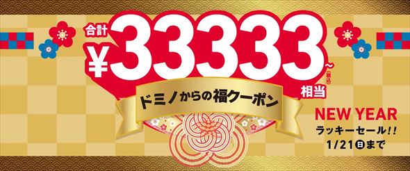 ドミノ・ピザから「ドミノからの福クーポン」 合計で3万3333円相当の割引