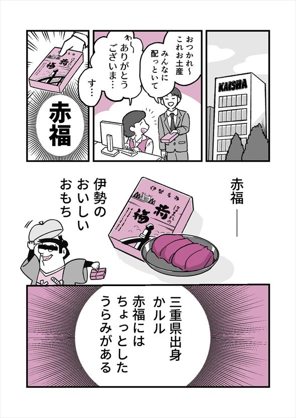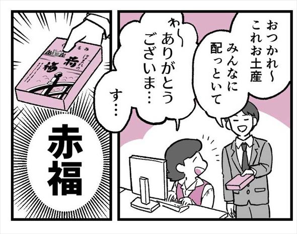 他にも分けづらいお土産はありましたが、赤福は分けづらさトップレベルです。マンガでは描けなかったのですが、一緒に赤福くばりをしたもうひとりの同僚の女性は私と同じく引きつった笑みを浮かべていました……笑