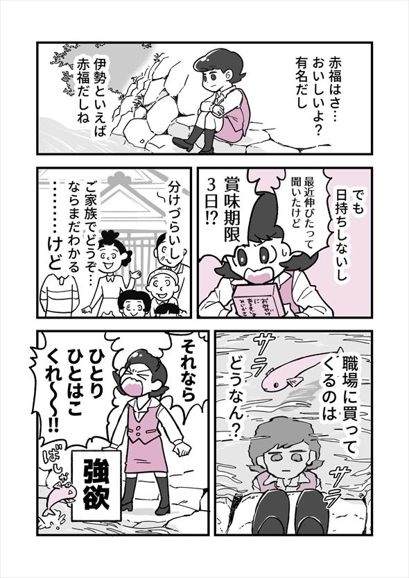 かルルさん 赤福をはじめ分けづらいお土産を買ってきてそれを配っといて……という人間が絶滅してほしいという思いと、三重でいちばん有名でおいしい赤福をお土産や差し入れとして渡したいけど渡せない……! というもどかしい思いをずっと抱いていました。持ち帰って食べるのもおいしいんですが、お店で食べるできたて赤福と一緒にいただけるお茶がとってもおいしくて皆に知ってほしいと思っていたので、職場での実体験とあわせてマンガに描いてみました。