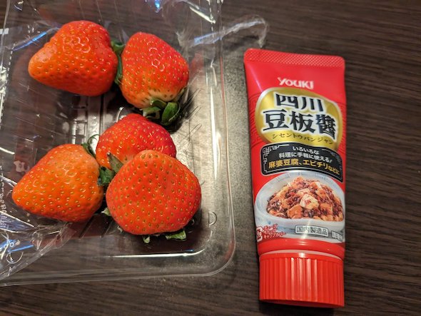 話題になっているのは、Xユーザーのtonkotutarou(@tonkotu0621)さんの投稿。赤白2色のパッケージのチューブは一見いかにも練乳のようですが、おもて面を確認すると、その正体はなんと「四川豆板醤」。危うく、スパイシーで刺激的ないちごが爆誕してしまうところでした。事前に気付くことができてよかった……!