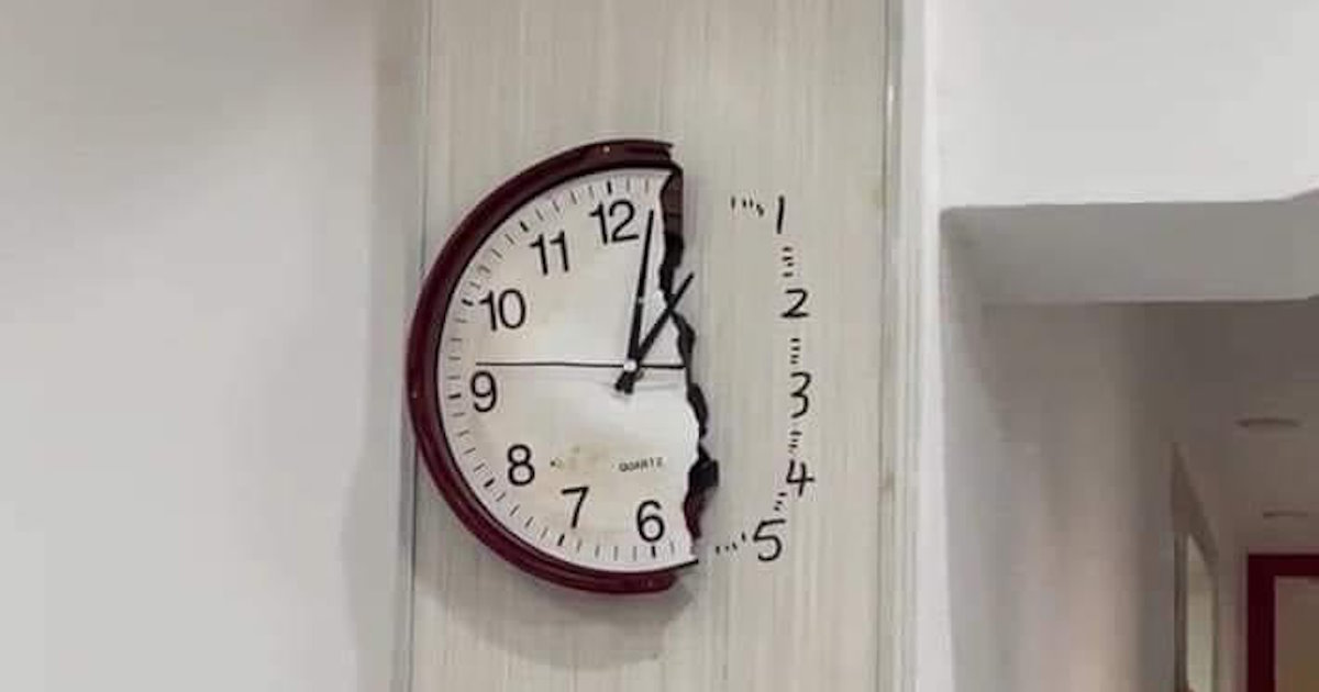 投稿されたのは、真ん中から2つに割れるような壊れ方をした壁掛け時計。壊れ方自体もレアですが、さらに無くなった文字盤部分を、直接壁にペンで手書きするという方法で繕っているのが衝撃的です。一周回ってこういうデザインの時計にも見えてくる……。