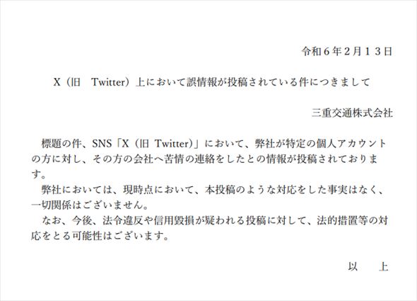 三重交通は2月13日、同社が特定の個人アカウントの勤務先に苦情の連絡をしたとのX(Twitter)上の投稿に対し、事実ではないと声明を発表しました。