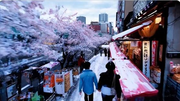 Soraは入力したテキストから最長60秒の動画を生成。詳細な場面や複雑なカメラの動きなども表現できるとしています。OpenAIはサンプルとして、「雪が積もった美しい東京の街がにぎわっている。カメラは、雪景色を楽しんだり、近くの店で買い物する人たちを追いながら通りを抜けていく。美しい桜の花びらが風に乗って雪片とともに飛んでいる」というテキストから生成した動画を公開しています。