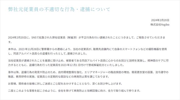 同社は、2023年11月28日に警察署から連絡があり、元店長を12月1日付けで懲戒解雇処分にしたとしている。従業員が逮捕されたことを厳粛に受け止め、被害者であるアルバイト従業員に心からのお詫びと説明を実施し、精神面のケアに尽力すると述べている。
