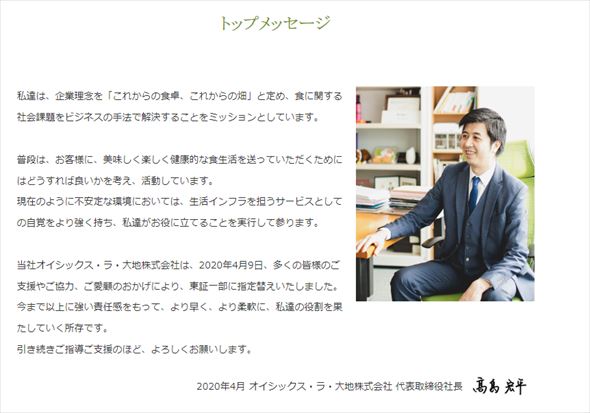 以前は会長と社長が掲載されていたトップメッセージのコーナーは既に社長のみに