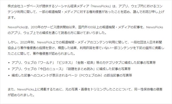 「NewsPicks」を運営するユーザーベースは2月29日、NewsPicksでのコンテンツ利用に関して一部の報道機関・メディアに対する著作権侵害があったとして謝罪しました