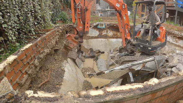 一通りの作業を終えたら、次は重機を使った作業。先端にコンクリートを砕く装備をつけたユンボで、少しずつプールを形作っているコンクリートを砕いて、ショベルでかき出す作業を繰り替えていきます。