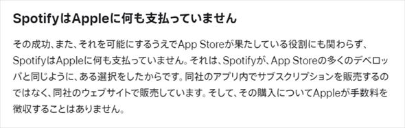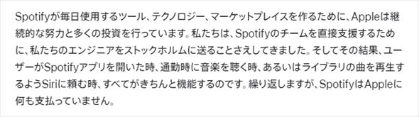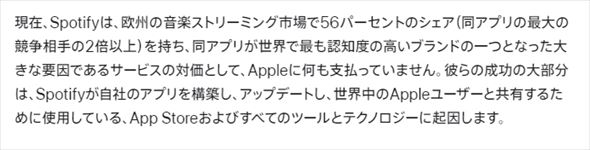 「彼ら(Spotify)は、Appleのツールやテクノロジーを使い、App Storeでアプリを配信し、私たちがユーザーと築いてきた信頼関係のメリットを得て、Appleにはその対価を何も支払わないことを望んでいます。つまり、Spotifyはさらに多くを要求しているのです」(Apple)