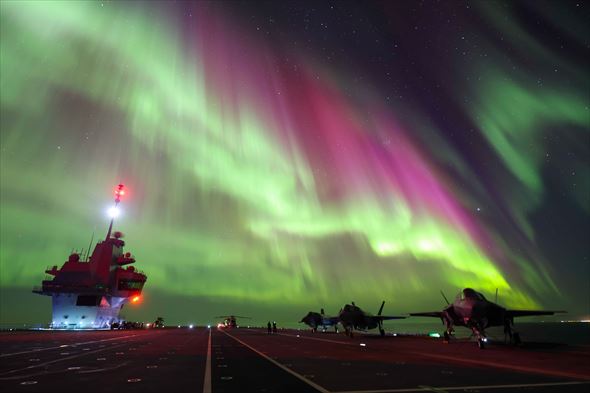 3月上旬にNATO(北大西洋条約機構)の軍事演習の際に観測したもの。「搭乗している多くの者にとって一生に一度の瞬間」として、英空母「プリンスオブウェールズ」艦上の戦闘機のうえにたなびく緑色や紫色のオーロラをとらえた写真を投稿しています。