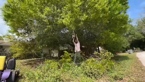 長い間放置されていた庭は、雑草や育ちすぎた木が生い茂り、まるでジャングルのような状態。芝刈り機をかけて雑草を取り除き、育ちすぎた木はチェーンソーでせん定していきます。