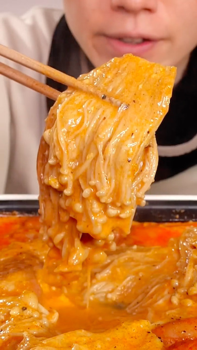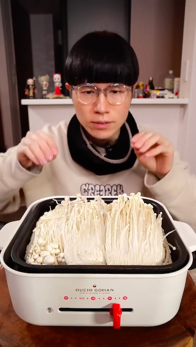 大量のエノキをホットプレートで煮込む! シズル感あふれる韓国風料理が食欲刺激で1700万再生の人気