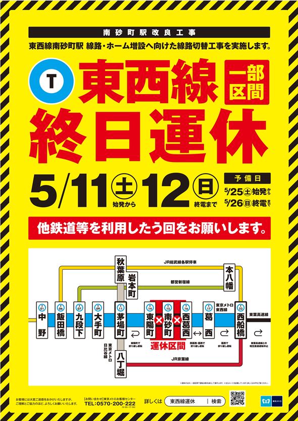 東京地下鉄(東京メトロ)の東西線が5月11日〜12日に、工事のため一部区間で終日運休します。同社は当日のう回ルートを案内しています。