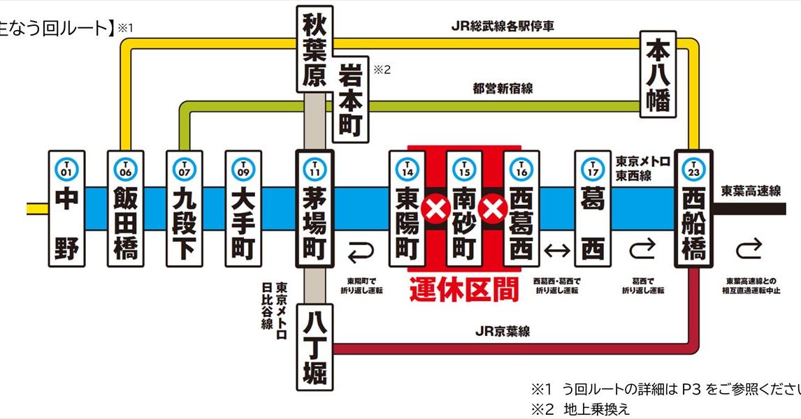 東京メトロは迂回ルートとして「西船橋駅からJR総武線・京葉線」「本八幡駅から都営新宿線」「茅場町駅から東京メトロ日比谷線」などを案内。特設サイトでは各駅から主要駅までの迂回ルートを紹介しています。
