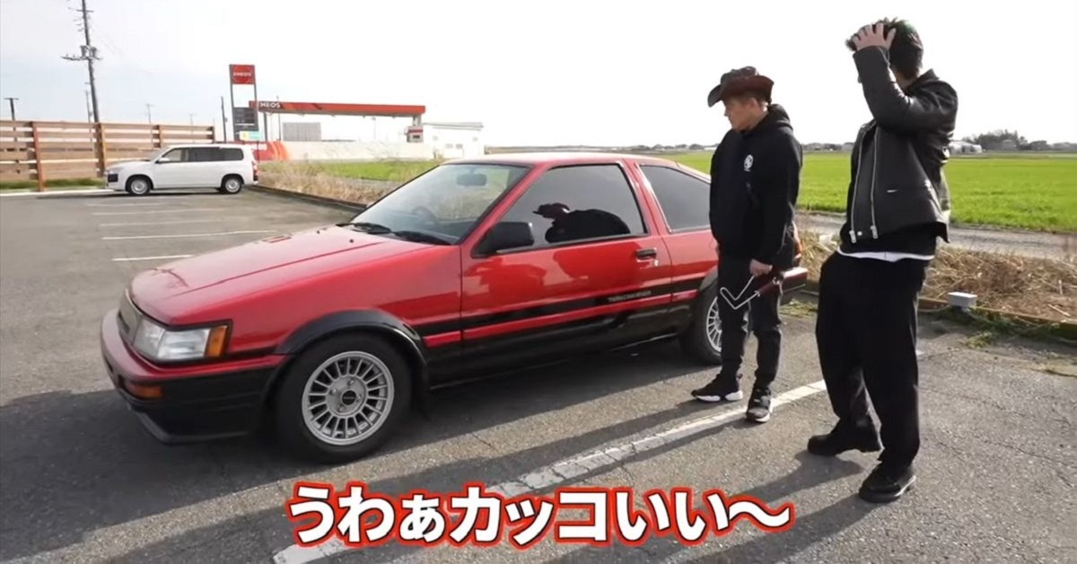 今回の動画は、親交が深い俳優の中尾明慶さんを助手席に乗せたドライブ企画がメイン。井戸田さんは待ち合わせ中、愛車がオイル漏れのため修理中であることをスタッフに説明すると、「代車くださいっていったら、スゴくない? ハチロクのレビン来たよ」「めちゃくちゃカッコいい!」と代車として“ハチロク”の愛称で呼ばれるトヨタ「カローラレビンAE86型」に乗っていることを明かしました。BMWの代車でハチロク!?