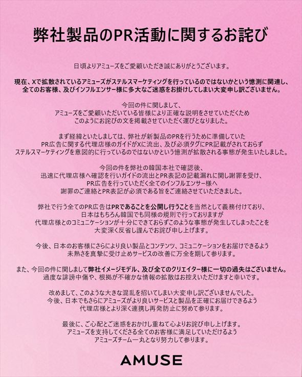 化粧品ブランド「アミューズ」はこのほど、ステルスマーケティング(ステマ)を行っているのではないかとの憶測がSNSで拡散されていた件についてコメントし謝罪しました。