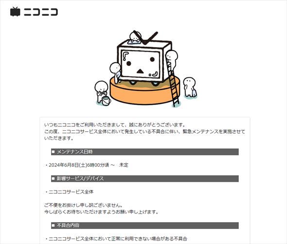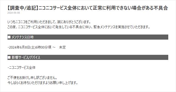 ニコニコ動画、ニコニコ生放送などニコニコサービスで6月8日早朝から障害が発生し、メンテナンスが12時間以上続いています。
