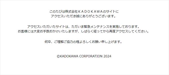 また親会社であるKADOKAWAでもこの日、Webサイトに「Http/1.1 Service Unavailable」のエラーメッセージのみ表示された状態になる、カドカワストアのKADOKAWA-IDでのログインや注文ができない問題が発生し、角川文庫などのWebサイトで緊急メンテナンスが行われるなどの状況が発生しています。