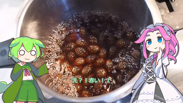 続いては、松ぼっくりを洗って水につけ、ヘタを切り落とします。圧力なべに入れたら、砂糖と水を加えて加熱。フタを開けて粘度が出るまで煮つめていくと、全体が赤くなってきました。色味もあいまって、見た目は完全にジャムです。