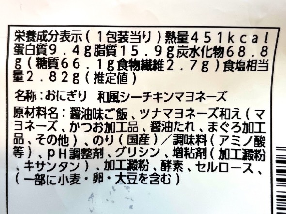 熱量451カロリー。一食として見ればそこまででもないけど、おにぎりとしてはかなり重い数字です