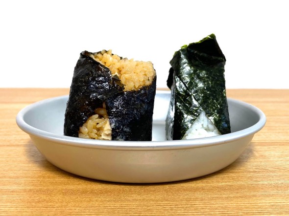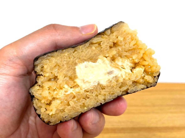半分に切ってみると、中にはしっかりツナマヨが。「総重量換算なんだから、具じゃなくてご飯の重量でカサ増ししてんじゃないの?」と思うかもしれませんが、包丁で切ってる最中に横から具がはみ出しそうになるくらい、中にはみっちりとツナマヨが入っていました。もう食べていいですか? 食べます。
